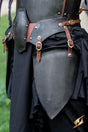 Epic Armoury’s Epic Dark Renegade Belt & Tasset is a combined belt and tasset , handcrafted from 1mm thick mild steel, and offers great protection and agility. The shape of the front plate is specifically designed to protect the upper thigh and lower waist, while also be more comfortable for a female player. The belt and tassets consist of a metal belt that loops around your waist with two tassets covering each front of your thigh. The tassets are connected to the belt via two vegan leather straps on each end of each tasset, which can be individually adjusted for the perfect fit. The belt and tasset designs, leaves both the inner thighs and crotch area exposed at the benefit of higher mobility.