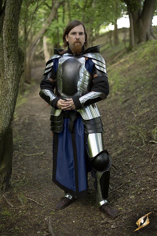 An essential for any person wanting to protect the legs while in battle. Consisting of cuisses to protect the lower thighs, black painted poleyns covering the knees, and half black demi-greaves protecting the upper shins, you’re less likely to take a pesky arrow to the knee--thus increasing your adventuring days. Three leather straps--one around the thigh, one below the knee, and one to attach to the belt--are used to keep each piece in place.