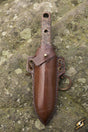 Epic Armoury’s Brown Thrust Knife Holder comes with a knife, and is specifically designed to hold the straight-edged Epic Armoury Thrust Knife throwing weapon. The handmade holder attaches to the belt or armour using two leather ties. A leather strap buttons over the knife, keeping it secure even in rough fights.
