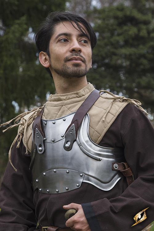 Epic Armoury’s Polished Merc Light Armour is a cuirass made from leather and steel covering the front of the wearer's torso. The front of this breastplate circles the wearer’s neck, sloping around the rib cage to protect under the arms. The lower edge of the breastplate rests over the sternum, curved to protect bone while providing lots of flexibility for the waist. The steel plate is fitted onto brown leather straps, attached to a large steel ring behind the shoulderblades. This design allows for the most maneuverability on varied body shapes and torso lengths.