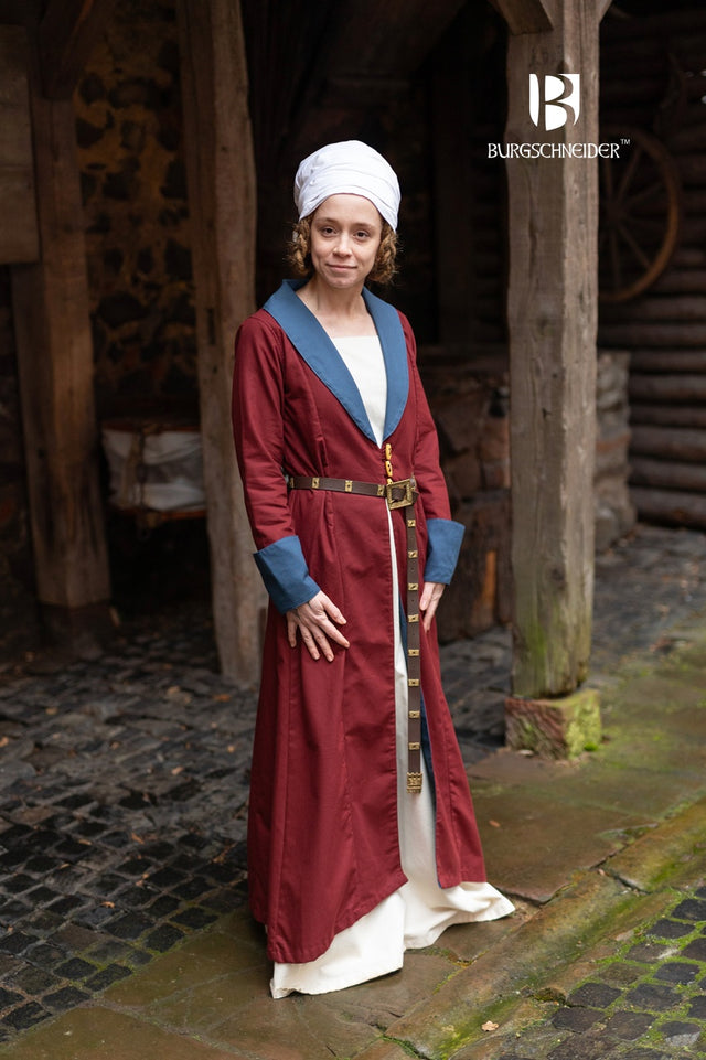 The Loretta Overdress has a flared bottom with three buttons below the lapel neckline. It features cuffed sleeves and an angular neckline with lapels and easily complements a variety of underdresses. The garment is made of 100% cotton for maximum comfort.
