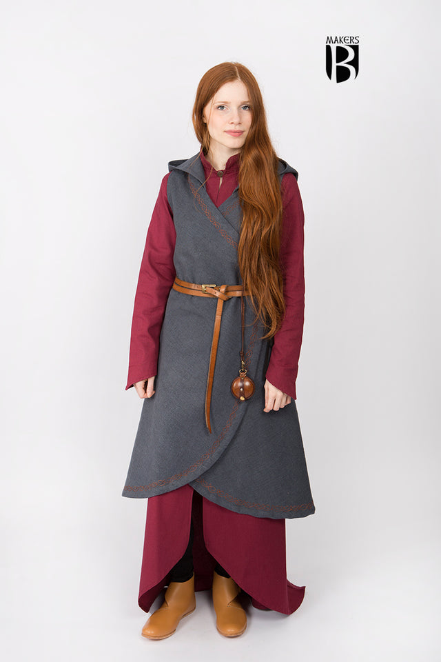 Charming wrap dress made of strong cotton with a linen-like structure which due to its nature individually adapts to the figure of the wearer. The dress is further refined by ornamental embroidery, a V-neckline, and a long hood. The different lengths of the front and back panels create a soft flowing and graceful look. The Wrap Dress Dala can be used to represent an elf, warrior, or archer - there are no limits to the imagination with this dress.