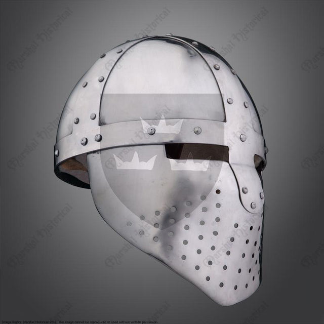 Inspired by models from the late 12th to 13 centuries, this Cabaset helmet is a great choice for history enthusiasts, reenactors, and anyone looking to create a historically inspired character concept. One of the helmet’s standout features is its visor design, carefully balanced to provide optimal visibility without compromising protection. The wide openings on the visor offer an unobstructed view. Strategically positioned holes on the visor allow for exceptional breathability.