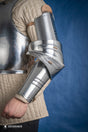 Diese sorgfältig gefertigte Rüstung aus dem 15. Jahrhundert nahtlos verbindet Schutz und Beweglichkeit. Hergestellt aus strapazierfähigem Stahl, besteht dieses Ensemble aus Oberarmrohren, Ellenbogenstücken und Unterarmfliesenrohren, die Ihre Gliedmaßen schützen.