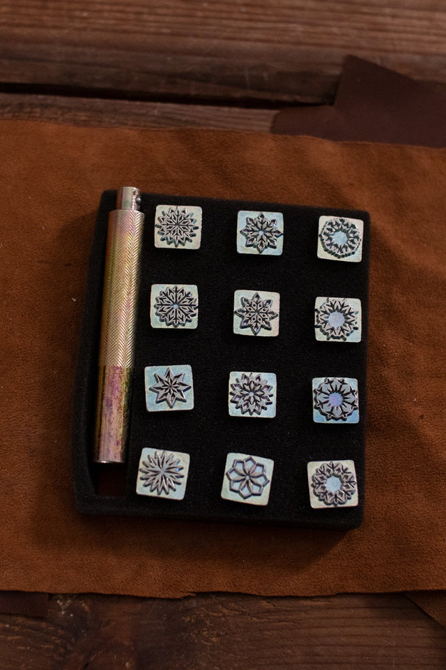 Dass Punziereisenset GEOMETRIC DESIGN ist perfekt, um deinem Leder eine persönliche Note zu verleihen. Bestehend aus 12 Stempeln und einem Griff.
