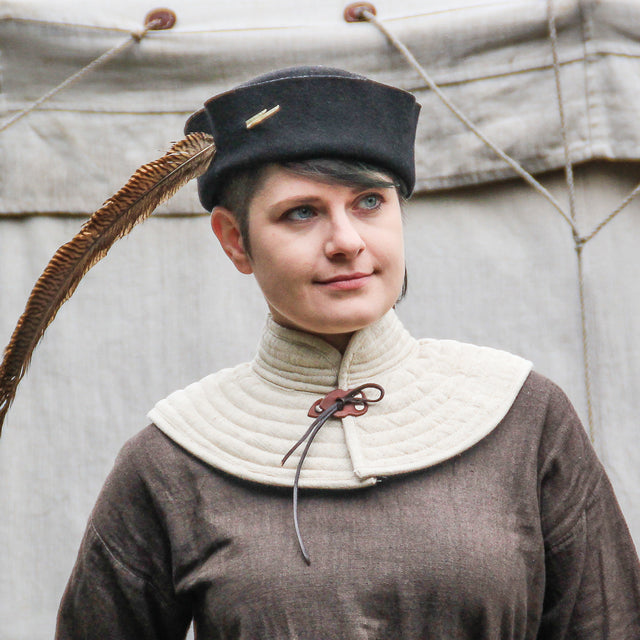 Ein leicht gepolsterter eng anliegender Kragen mit einem dezenten Verschluss. Er eignet sich bestens als Polsterung unter einer Halsberge oder einem Kettenhemd. Auch ohne Rüstungsteile bildet er eine kleidsame Ergänzung zu verschiedenen Obergewandungen, wie zum Beispiel einer Tunika oder Robe. Dank der kleineren Abmaßungen ist er auch gut für Mädels geeignet.