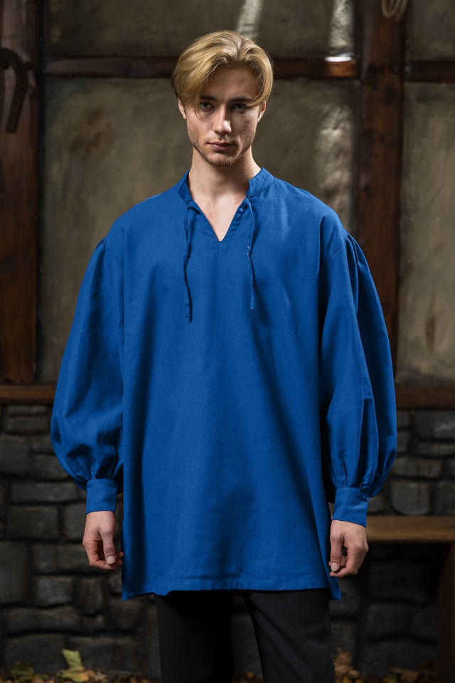 Mit großen, wallenden Ärmeln und eng anliegenden Manschetten entworfen, bietet dieses Hemd sowohl Stil als auch Funktionalität, ermöglicht Bewegungsfreiheit und bewahrt gleichzeitig eine imposante Silhouette. Der Schnürkragen-Schlitz bietet einen anpassbaren Look - tragen Sie ihn offen für eine robuste, kampferprobte Ästhetik oder binden Sie ihn geschlossen für eine formellere, befehlende Präsenz.