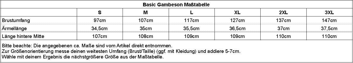 Das Live-Action-Basics-Gambeson besteht aus schwerer Baumwoll-Canvas mit einem leichten Baumwollfutter. Es ist so konzipiert, dass es unter Rüstungen getragen oder als eigenständiges Kleidungsstück verwendet werden kann. Die Polsterung besteht aus Polyesterwatte, die es reiß- und druckfest macht.