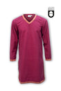 This Tunic is a foundational piece that complements a wide range of character concepts. This longer-cut tunic is designed with side slits, ensuring optimal maneuverability—perfect for both battle reenactments and long treks. The tan lines along the neckline, cuffs, and hem are adorned with intricate designs, infusing a touch of sophistication and intrigue, elevating the tunic's overall appeal.