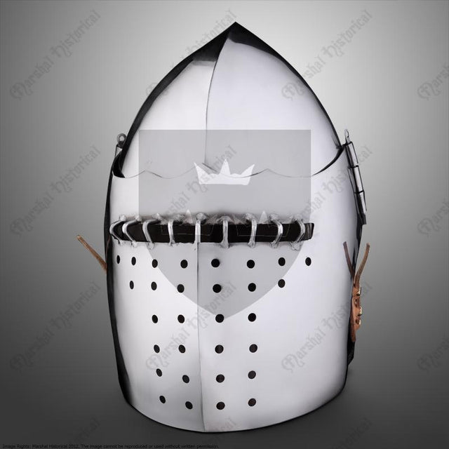 This Battle Bascinet is a helmet that combines historical design with modern enhancements, offering optimum head protection and clear visibility. Equipped with a larger diameter rivet, this helmet ensures a secure fit, while the inclusion of pins allows for effortless removal. Its rivet spring locking system guarantees a snug and steadfast position.