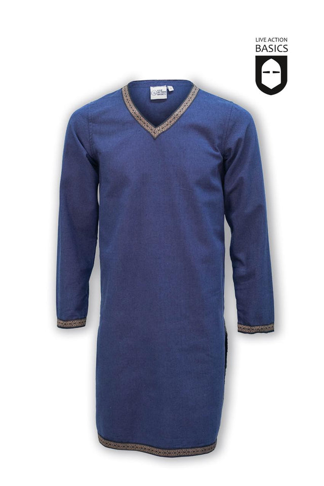 This tunic works as a versatile cornerstone for a wide array of outfit combinations allowing you to embody a diverse range of character concepts. Designed with a longer cut, the tunic is equipped with side slits, ensuring exceptional maneuverability – an invaluable asset for battle reenactments and extensive journeys. The tan lines along the neckline, cuffs, and hem showcase intricate designs that add an element of refinement and fascination, enhancing the tunic's overall aesthetic.